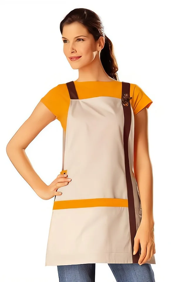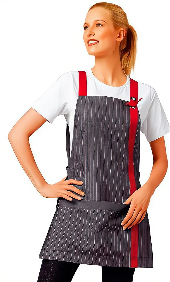 Фартух зі спинкою. Пошитий зі змішаної тканини однотонної або в смужку, контрастного кольору смуга на кишені, вертикальна смуга спереду та бретелі.