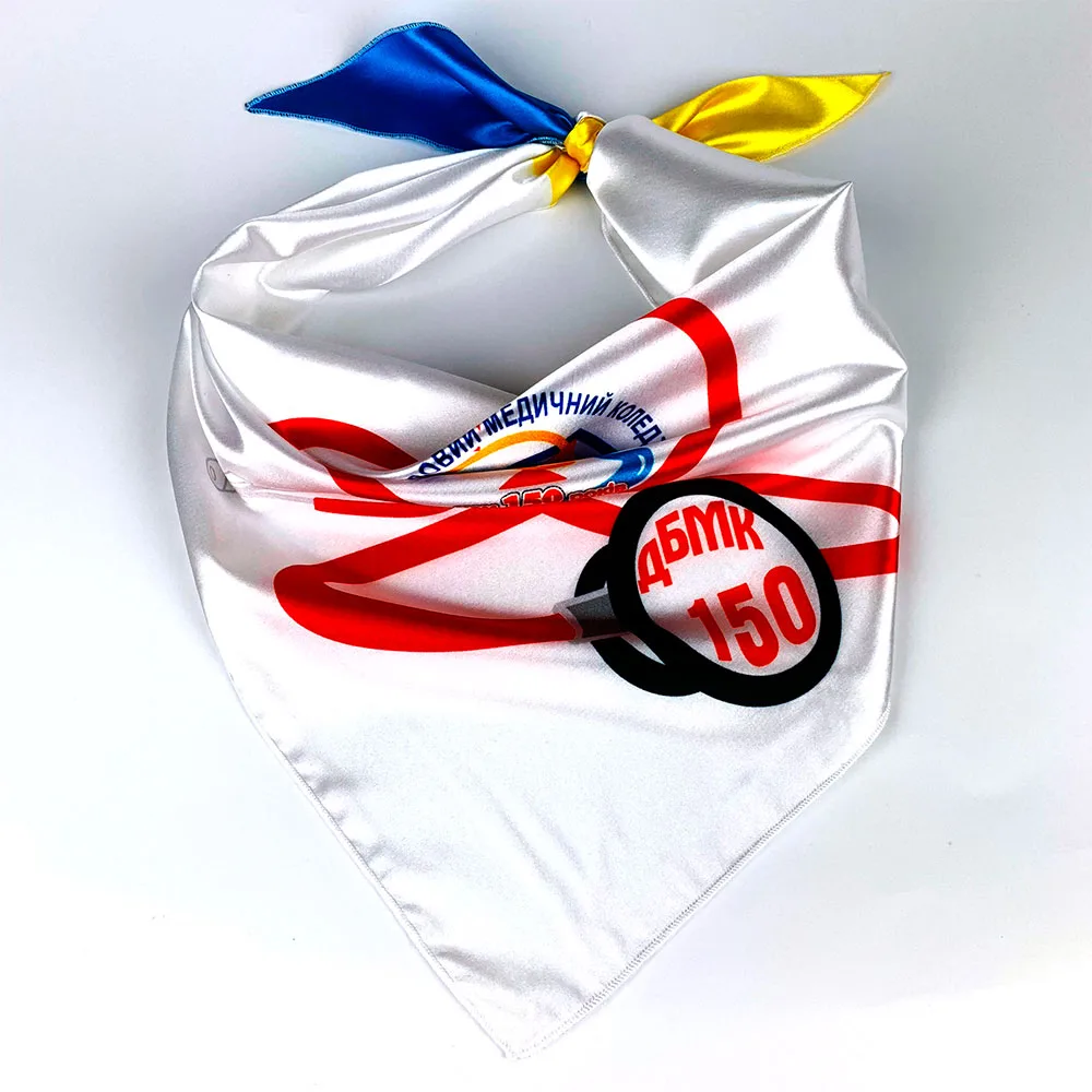 Косинка з дизайном, краватки, хустки, шарфи та бандани, виготовляються на замовлення згідно з макетом клієнта, з логотипом та у фірмових кольорах компанії.