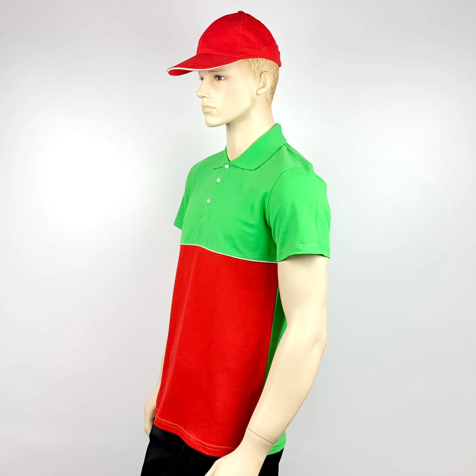 Пошив чоловічої теніски поло з короткими рукавами та з контрастним оздобленням. Планка на три ґудзики. Поло у фірмових кольорах замовника
