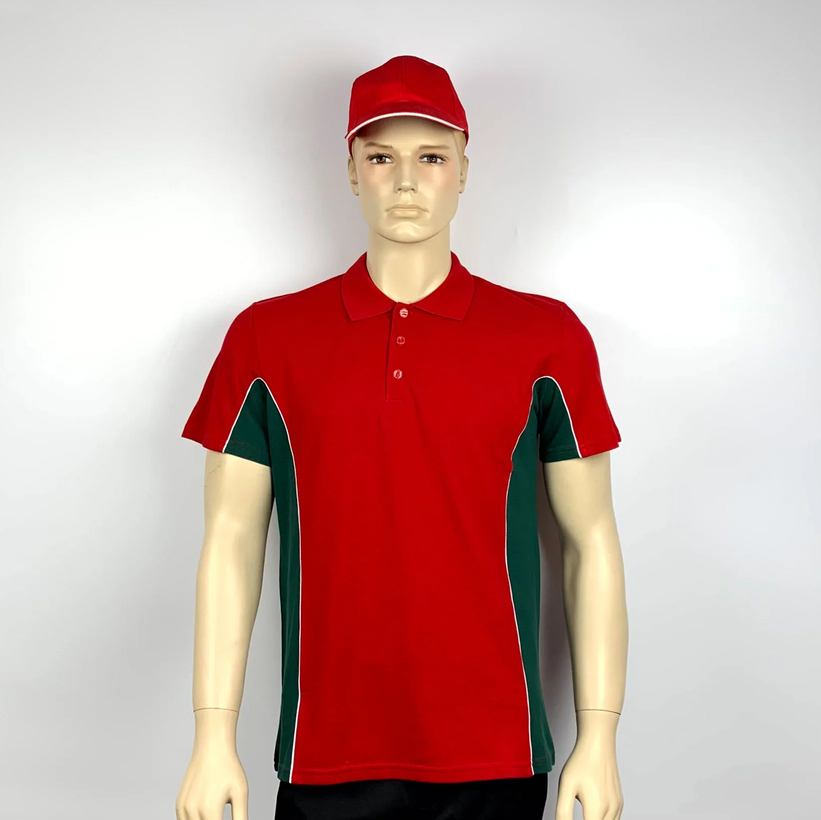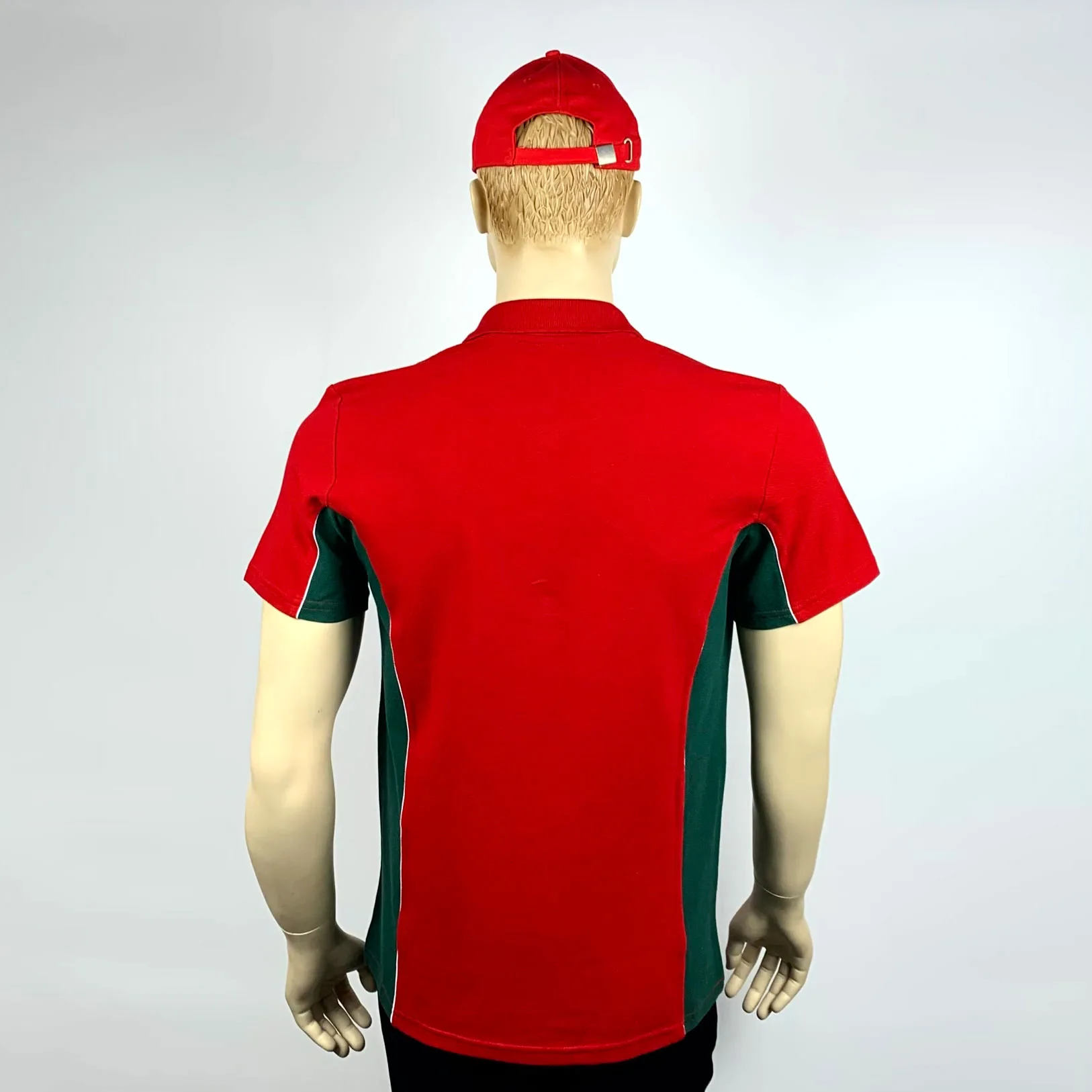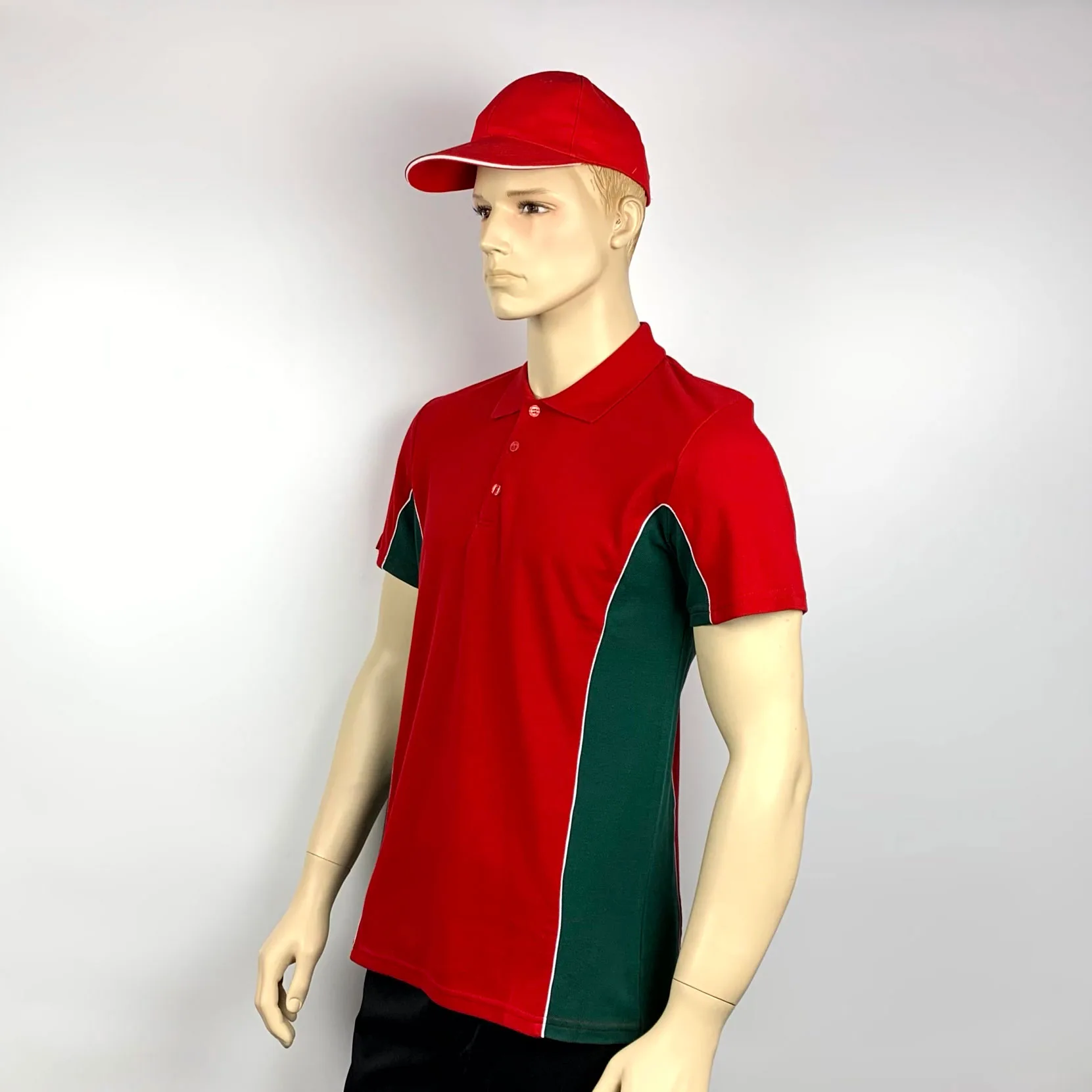 Футболка-поло має основний колір тканини — червоний. Поло має вставки зеленого кольору під рукавами та по боках грудей. Між тканинами основного кольору та тканиною оздоблення вставлений білий кант.