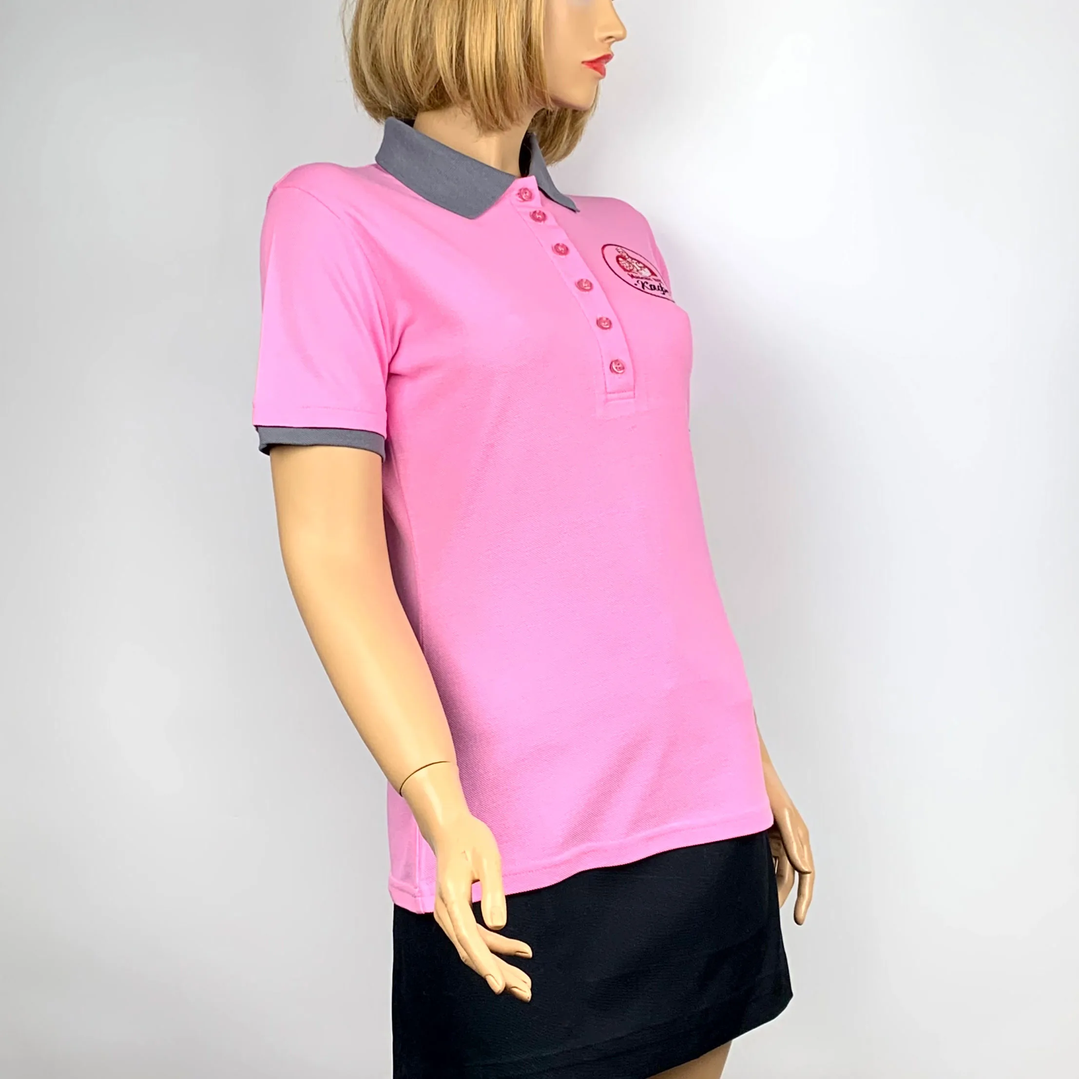 Пошив жіночої приталеної теніски поло з короткими рукавами та з контрастним оздобленням комірця та рукавів. Планка на шість ґудзиків. Вишивка логотипу кафе Мамин Хліб на грудях.