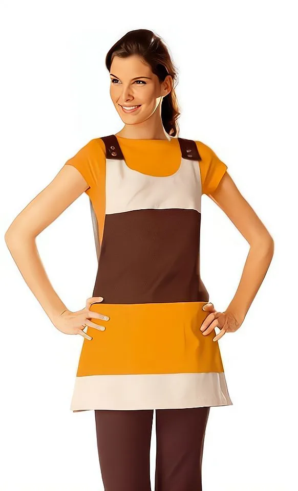 Фартух зверху має бретельки на кнопках. Спереду велика накладна кишеня розділена рядком на два відділення.
