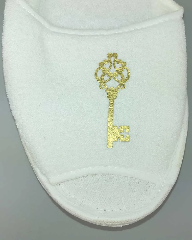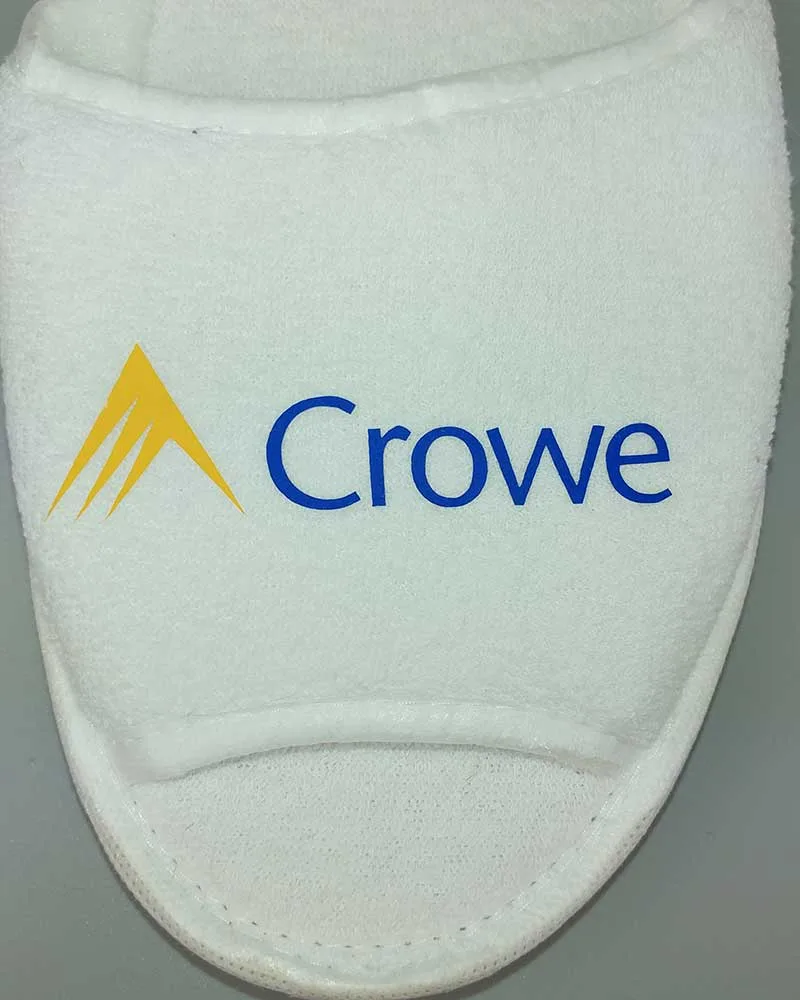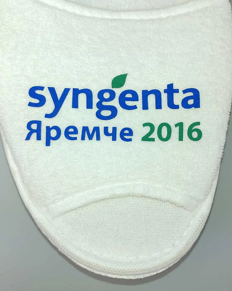 Нанесення логотипу на махрові капці виконується метод термодруку плівкою.