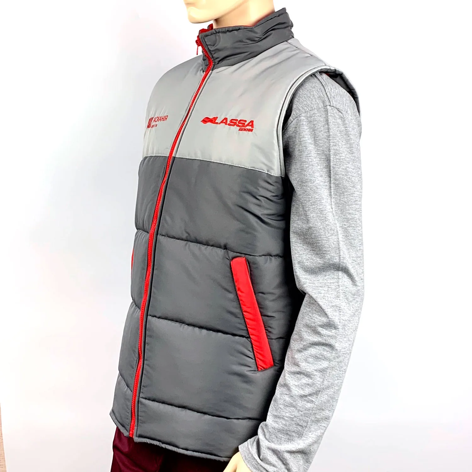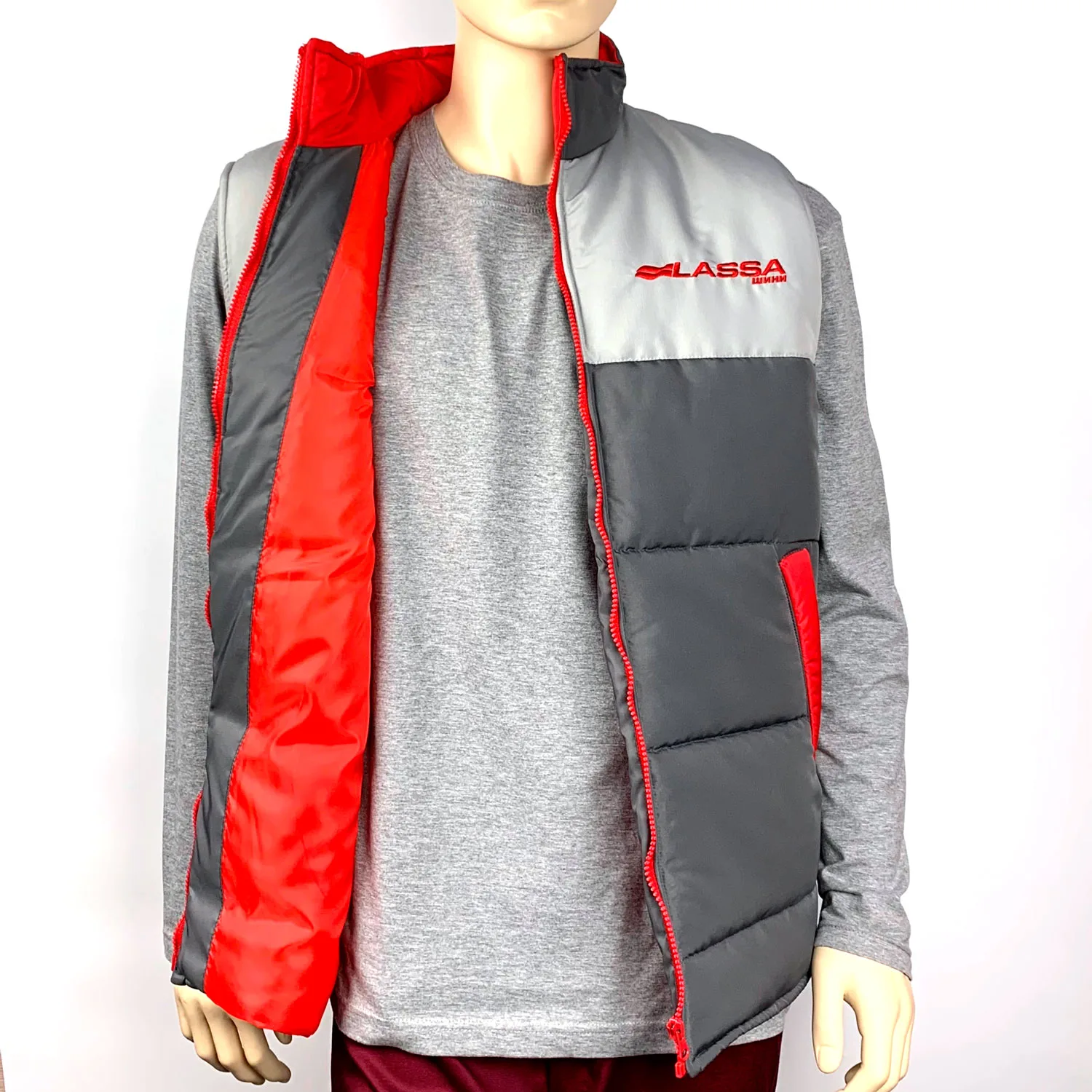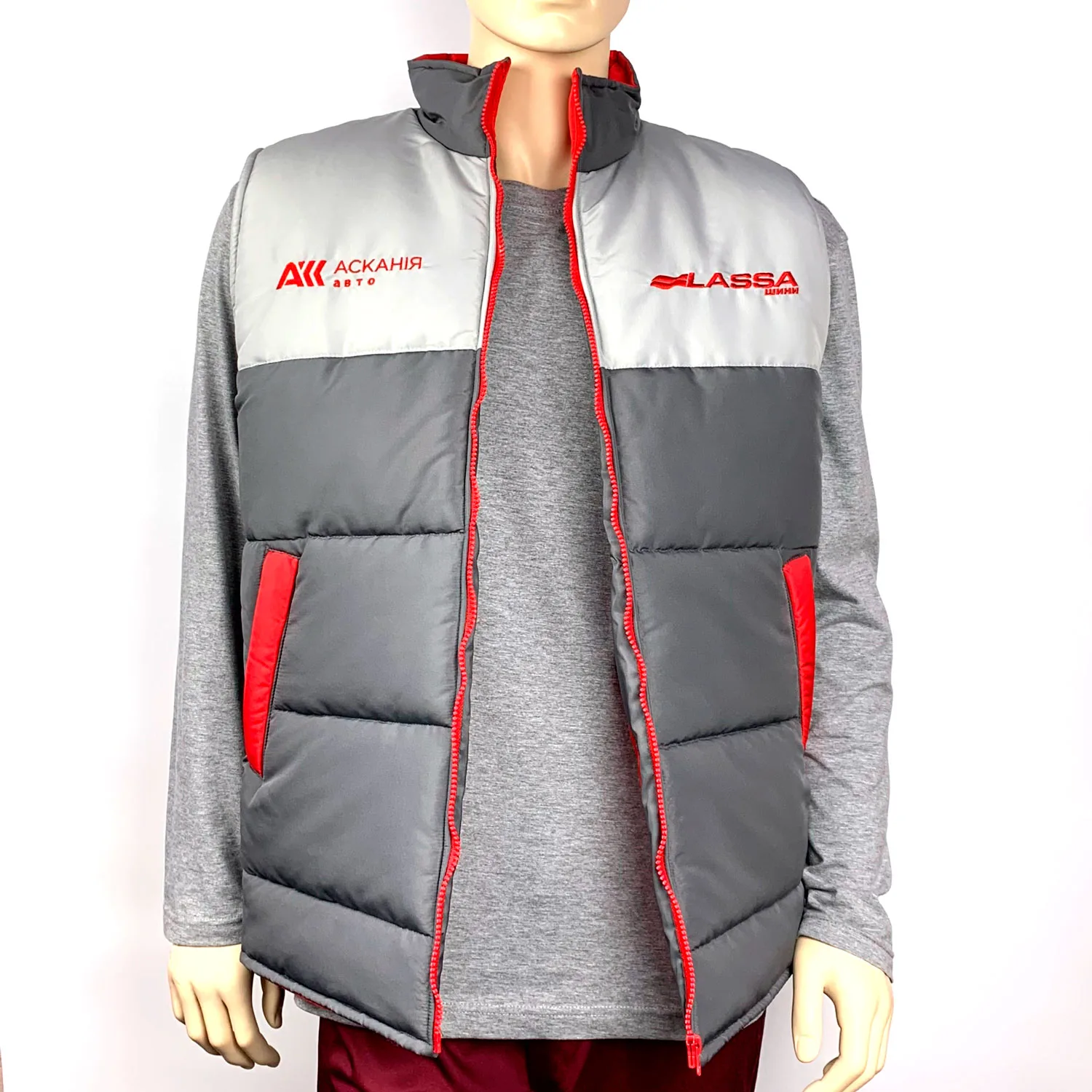 Жилетка на синтепоні в фірмових кольорах з вишивкою логотипа “Асканія авто” та “Lassa шини”.