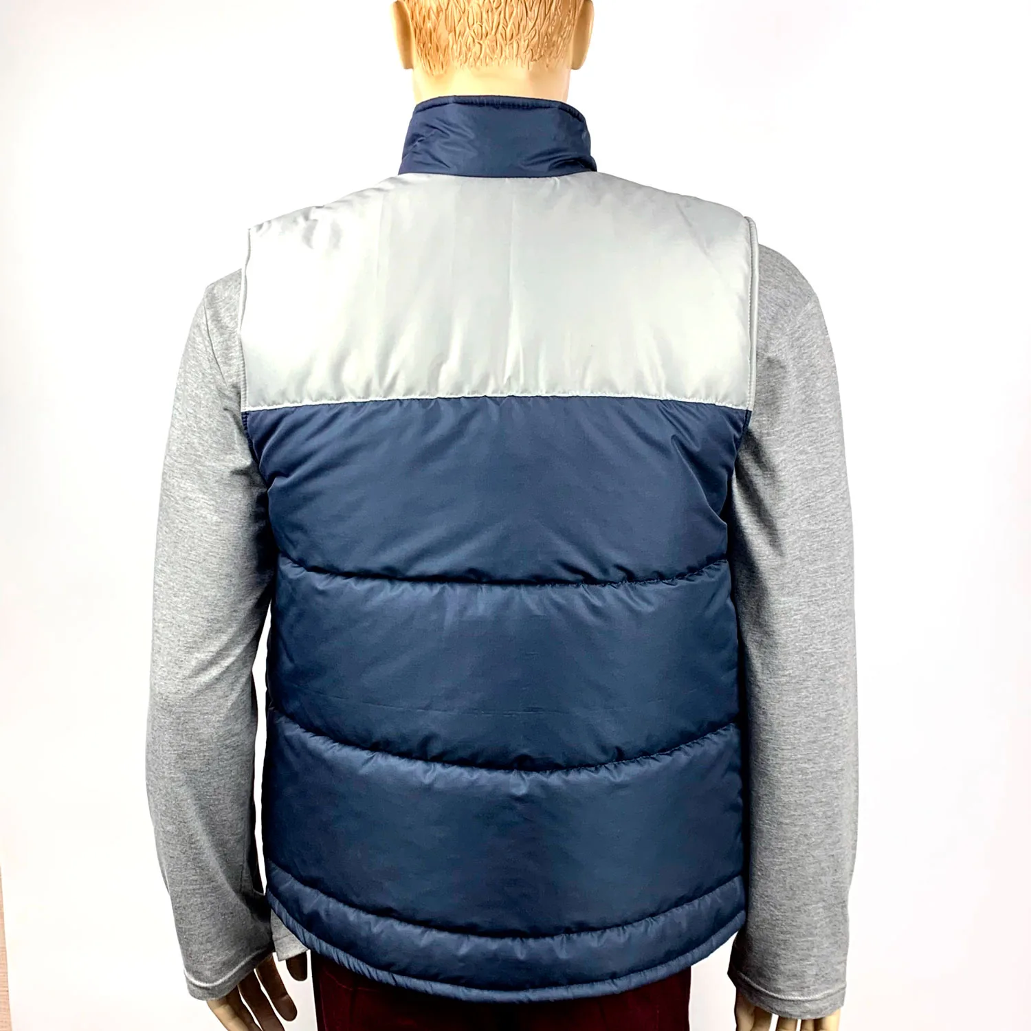 Жилет синього кольору, з кокеткою контрастного світло-сірого кольору, підкладка – синя. Жилет має прямий фасон, без капюшона, спереду дві прорізні кишені з відкритою блискавкою “в рамочку”. Жилет застібається на роз’ємну блискавку.