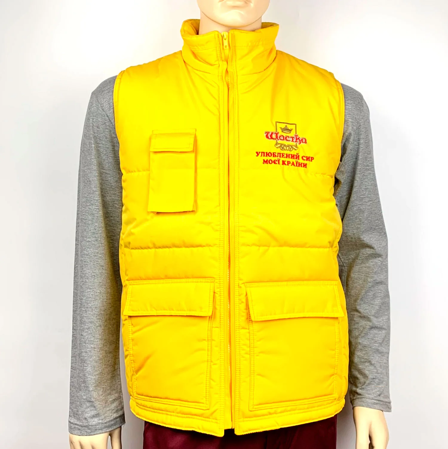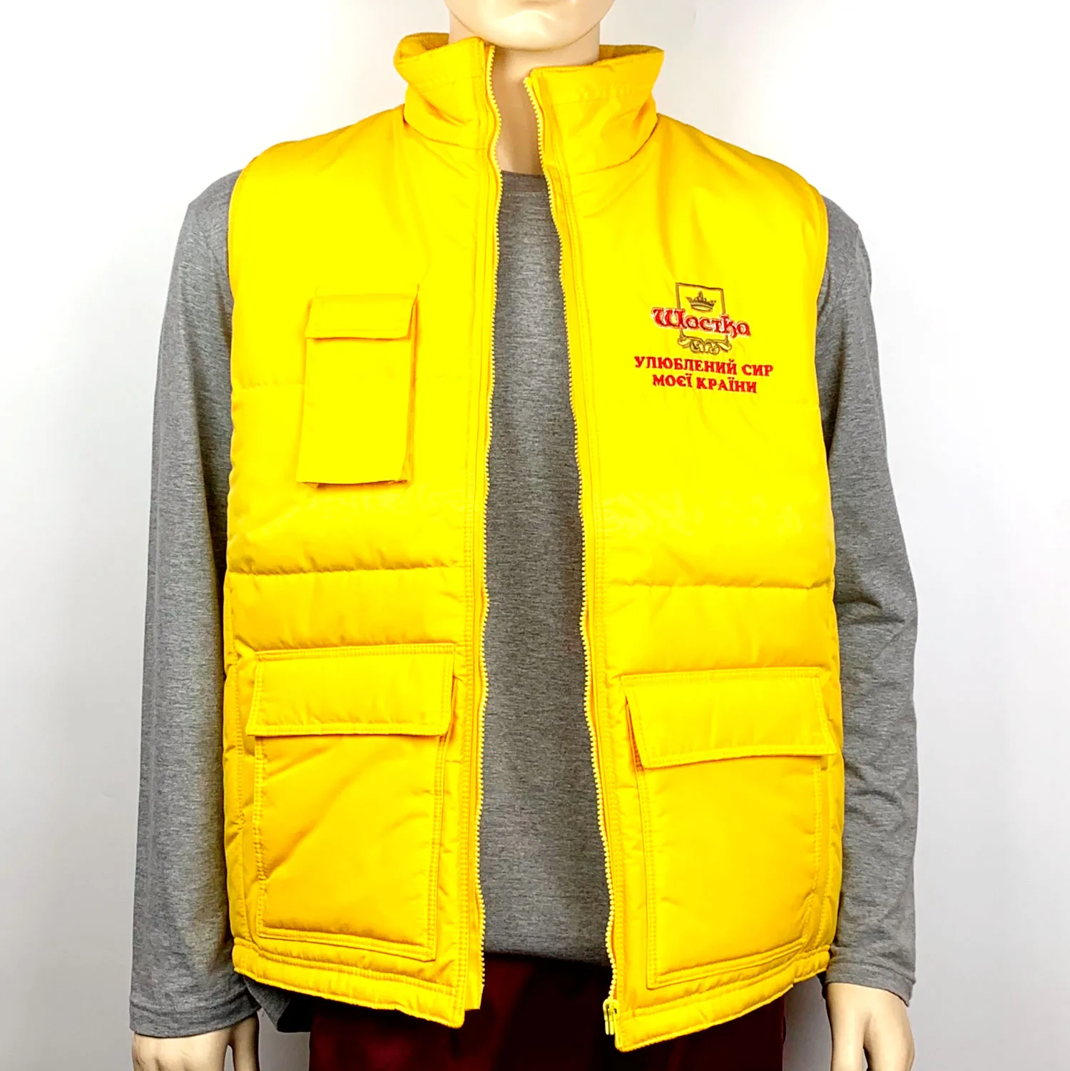 Утеплений жилет (модель №3) пошитий на синтепоні має вишивку логотипа торгової марки “Шостка – Улюблений сир моєї країни” на грудях та на спині.