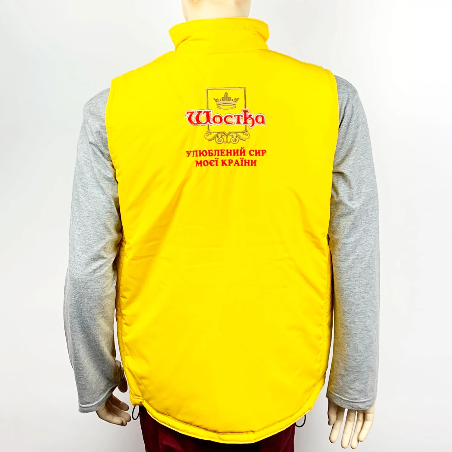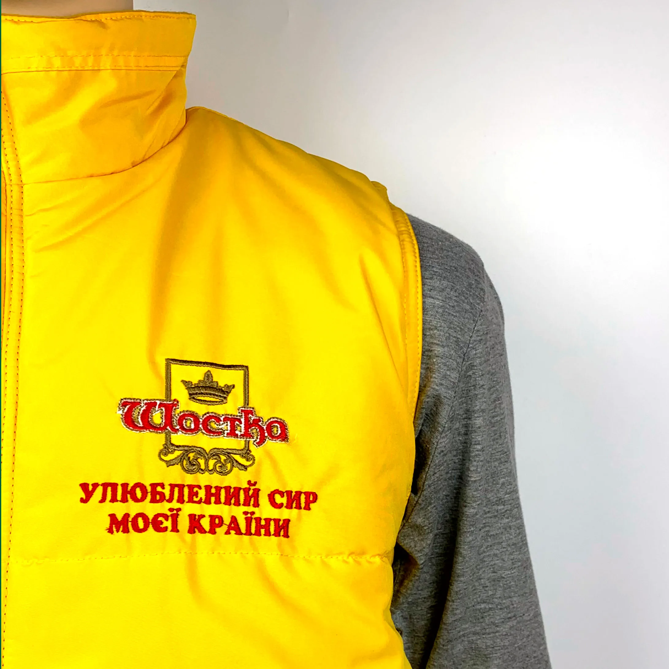 Утеплений жилет має вишивку логотипа торгової марки “Шостка – Улюблений сир моєї країни” на грудях та на спині.