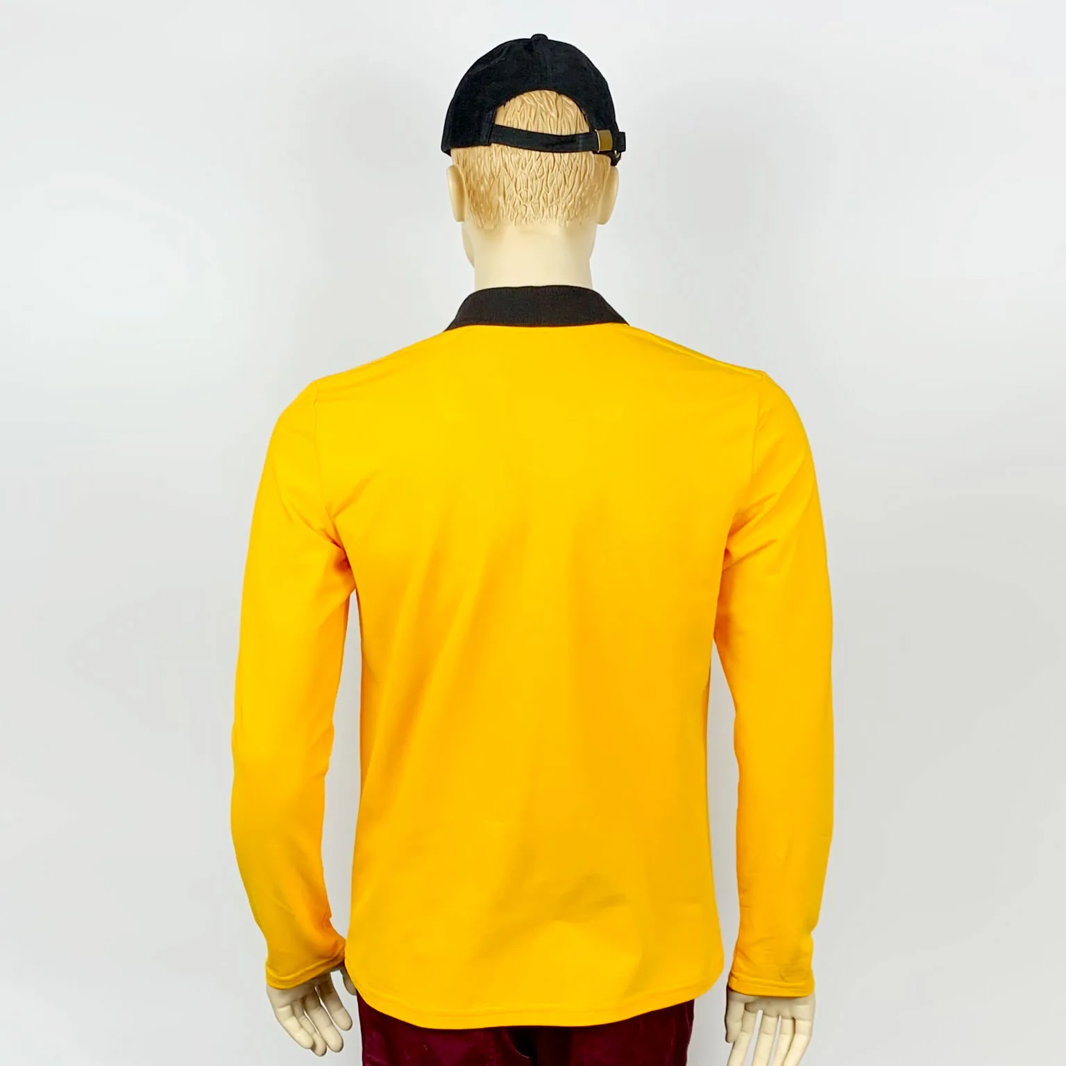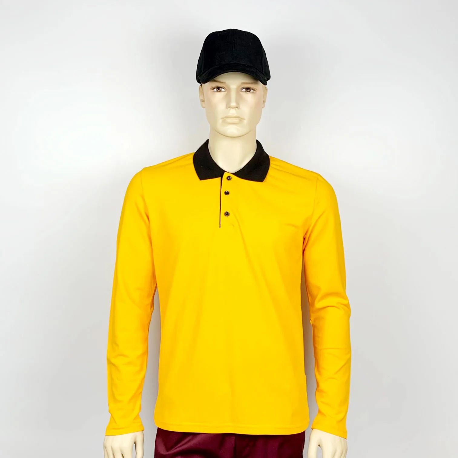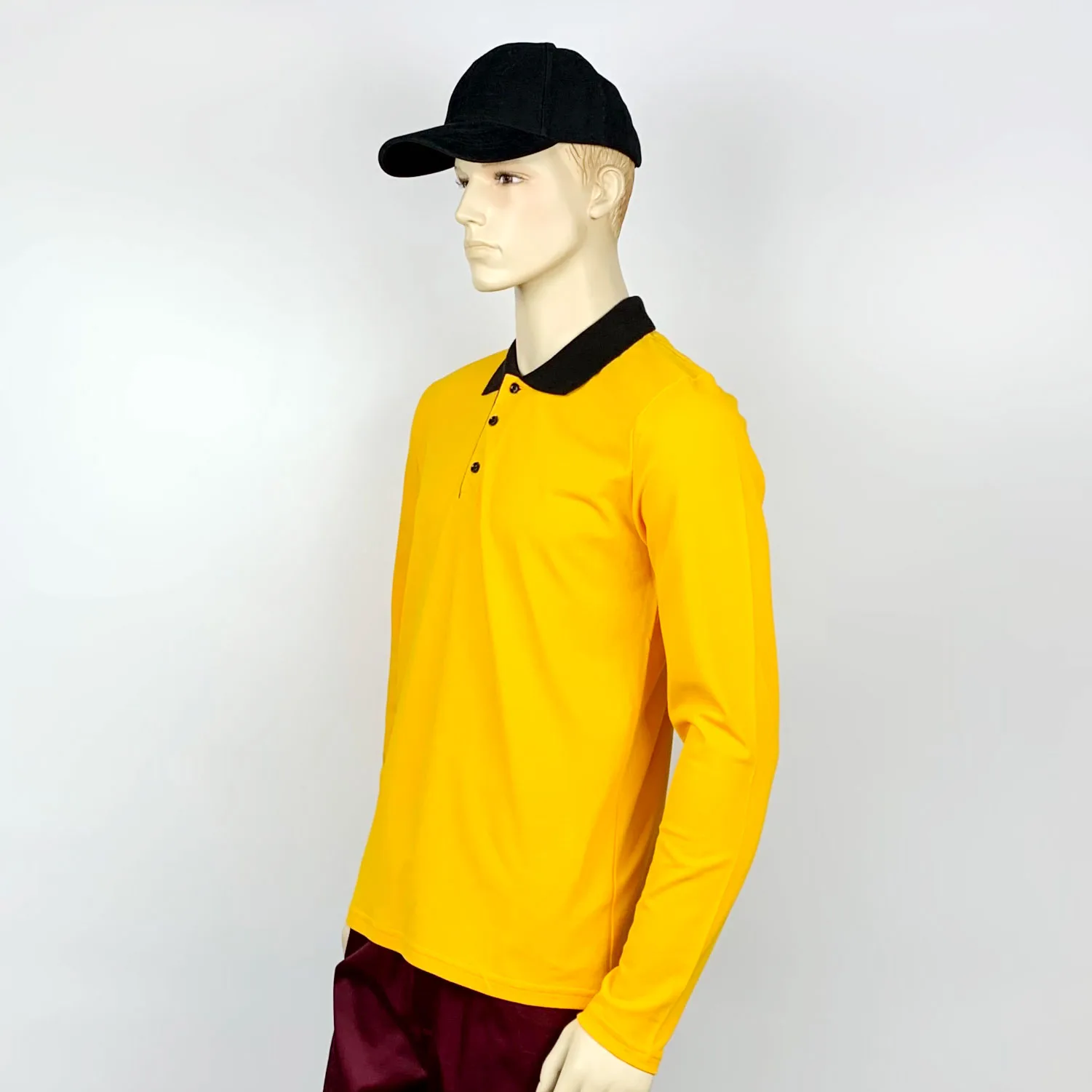 Футболка-поло сшита в контрастном цвете. Основной цвет поло – желтый, вязаный трикотажный воротничок черного цвета. У поло длинные рукава.