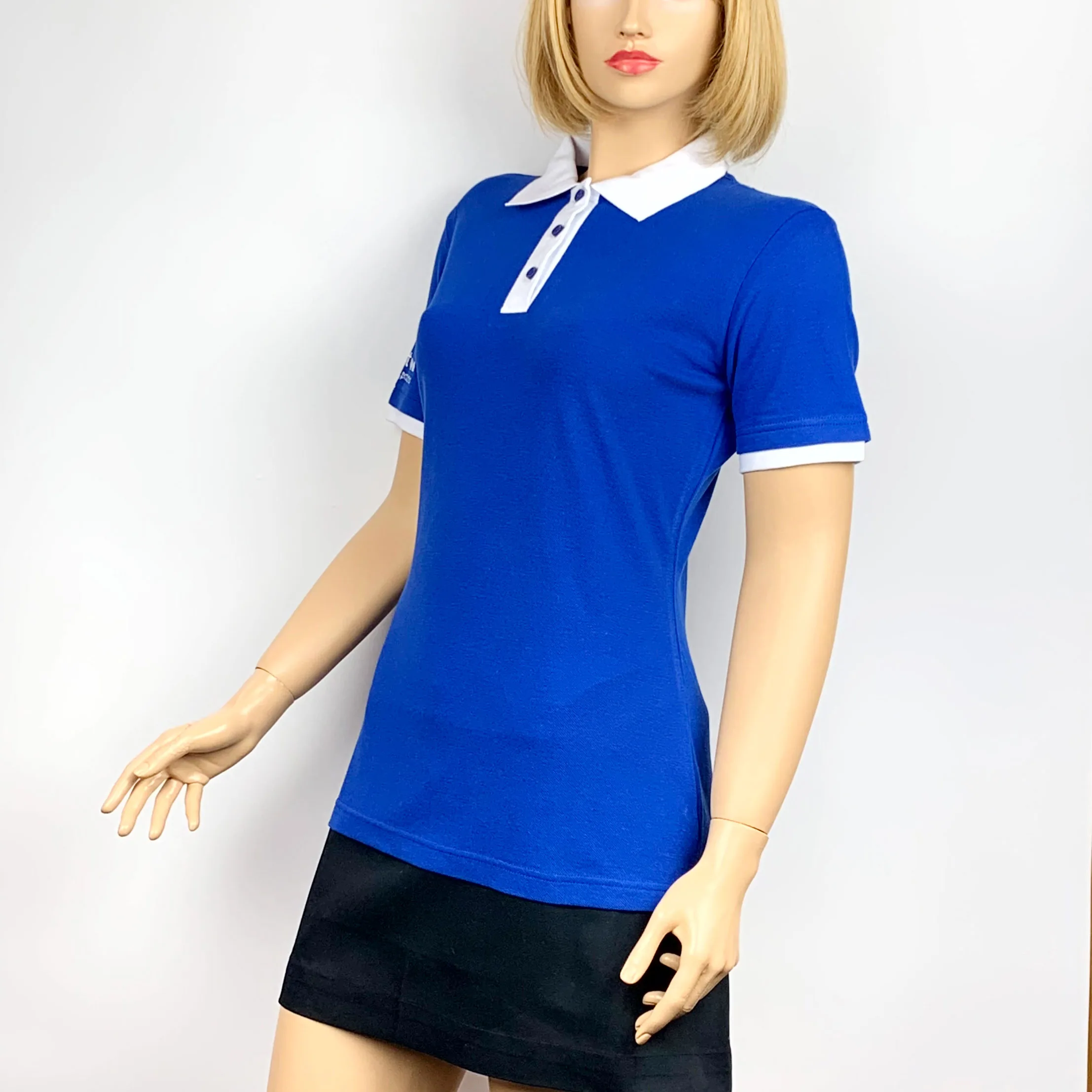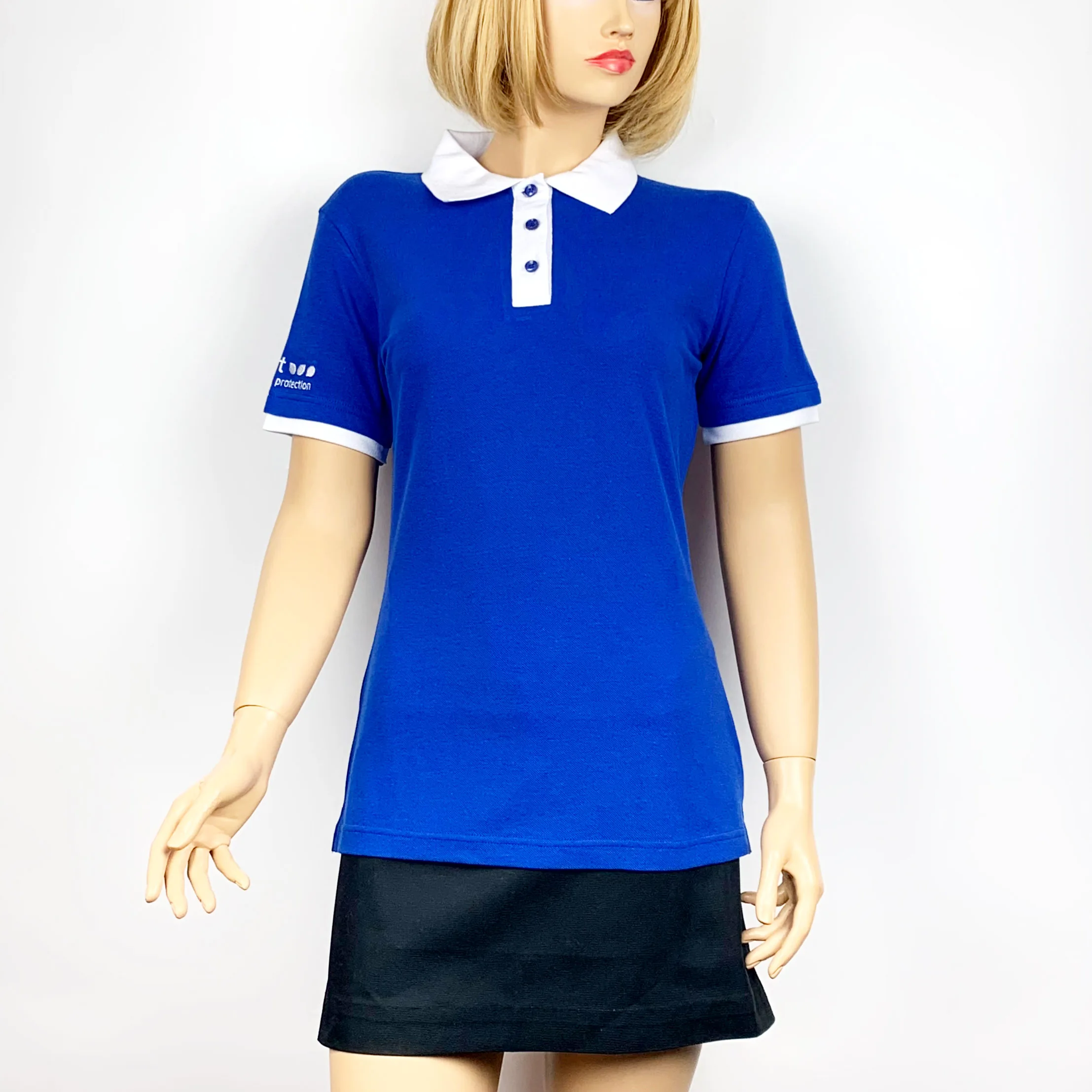 Пошив женской тенниски поло с короткими рукавами и с контрастной отделкой. Пошив на заказ с вышивкой логотипа на рукаве.